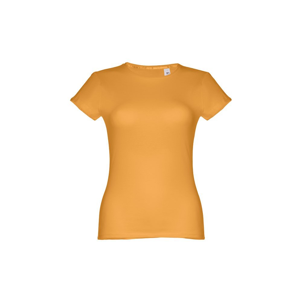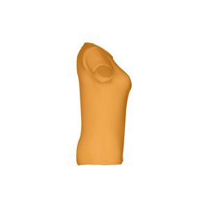 T-shirt cintada para senhora em malha jersey 100% algodão (150 g/m²) com fio de algodão cardado (cor 183: 90% algodão/10% viscose, cor 196: 98% algodão/2% viscose). Contém gola fina dupla em jersey com fita de reforço em cetim. Peça cortada e cosida com costura dupla nas mangas e parte inferior. Tamanhos: S, M, L, XL, XXL